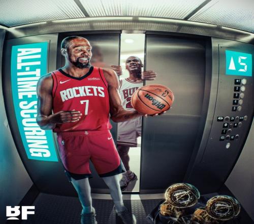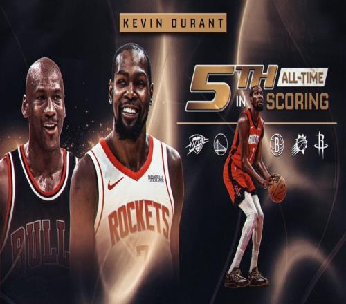 在周六晚火箭123-122戰勝邁阿密熱火的比賽中,凱文·杜蘭特超越了邁克爾·喬丹,升至歷史得分榜第五位。本場比賽前,他距離追平喬丹32292分的職業生涯總得分還差25分,考慮到杜蘭特本賽季的場均得分(25.7分)正好與此相當,這顯然是一個可以達成的數字。