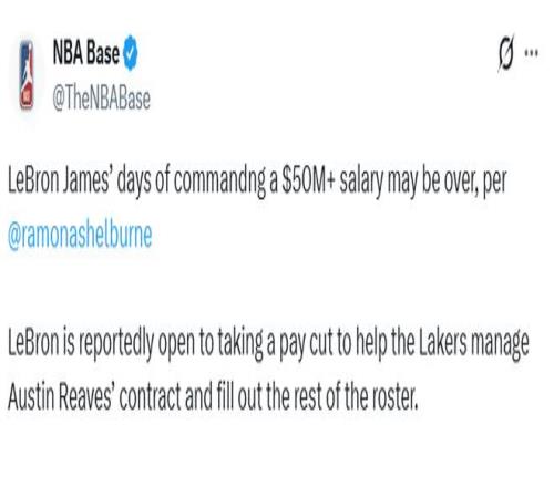 北京時間3月24日,ESPN名記謝爾本報道,詹姆斯拿5000萬美元以上年薪的日子可能已經結束了。報道稱,詹姆斯愿意接受降薪,以幫助湖人處理里夫斯的續約合同,并為球隊填充陣容騰出薪資空間。