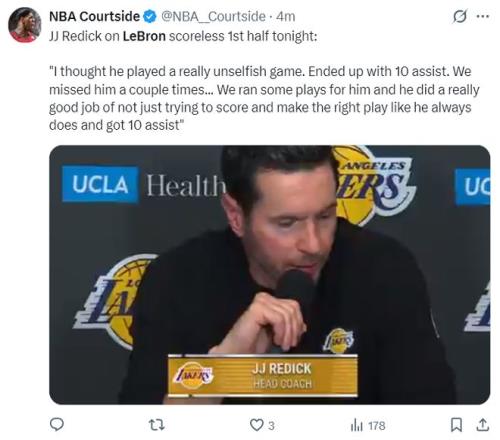 賽后雷迪克談到詹姆斯這場比上半場0分,他說道:我覺得他這場比賽打得非常無私,最終他貢獻了10次助攻,他有幾次很好的傳球隊友沒能接好,我們為他設計了一些戰術他實施的很完美,不僅在下半場努力得分還能正確的傳球。