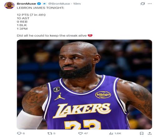 但下半場詹姆斯回暖,尤其是第四節詹姆斯單節7分,東契奇末節4分,里夫斯末節2分,很明顯詹姆斯在末節是發揮最出色的那個。詹姆斯全場比賽39分鐘,10中4,三分2中1,罰球3中3,拿到12分10助攻9籃板1蓋帽,命中率40%,三分命中率50%,真實命中率53%。