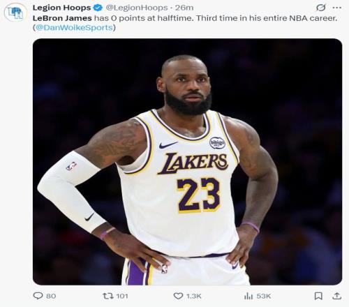 整個上半場詹姆斯也是疲態盡顯,打無球的各種空切消耗也很大,他半場5中0+三分1中0沒有得分送出6個助攻,這是他生涯第三次上半場0分的尷尬紀錄。