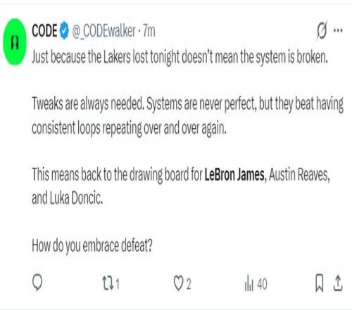 美媒CODE:不要因為湖人輸掉了一場比賽就覺得整個體系出了問題,調整是必要的但體系沒有任何問題,好的東西需要延續下去,東契奇、里夫斯、詹姆斯的球權可能要調整一下。
