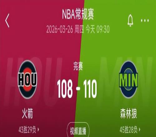 迎戰人員嚴重不整的森林狼,火箭在加時賽一度手握13分巨大優勢,卻在短短180秒內被對手轟出15-0的窒息攻勢,最終以108-110飲恨客場。