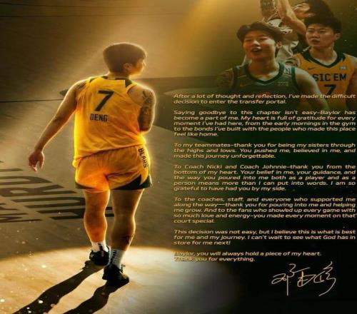 北京時間4月3日消息,中國女籃希望之星鄧雨婷于4月3日通過社交媒體正式宣布進入NCAA轉校大名單(Transfer Portal),結束在貝勒大學的籃球生涯,引發國內籃壇廣泛關注。這位22歲的中國女籃潛力新星,是首位以常規輪換身份隨隊闖入NCAA“瘋狂三月”第二輪的中國球員,其動向牽動著中國女籃未來鋒線建設的期待。