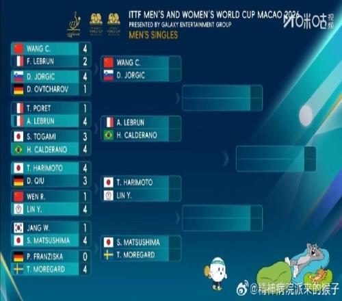 中國澳門乒乓球世界杯男單八強:王楚欽vs達科、張本智和vs林昀儒