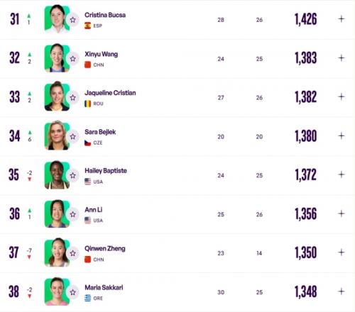 再跌7位!WTA最新排名:鄭欽文從第30下滑到37王欣瑜升2位排第32